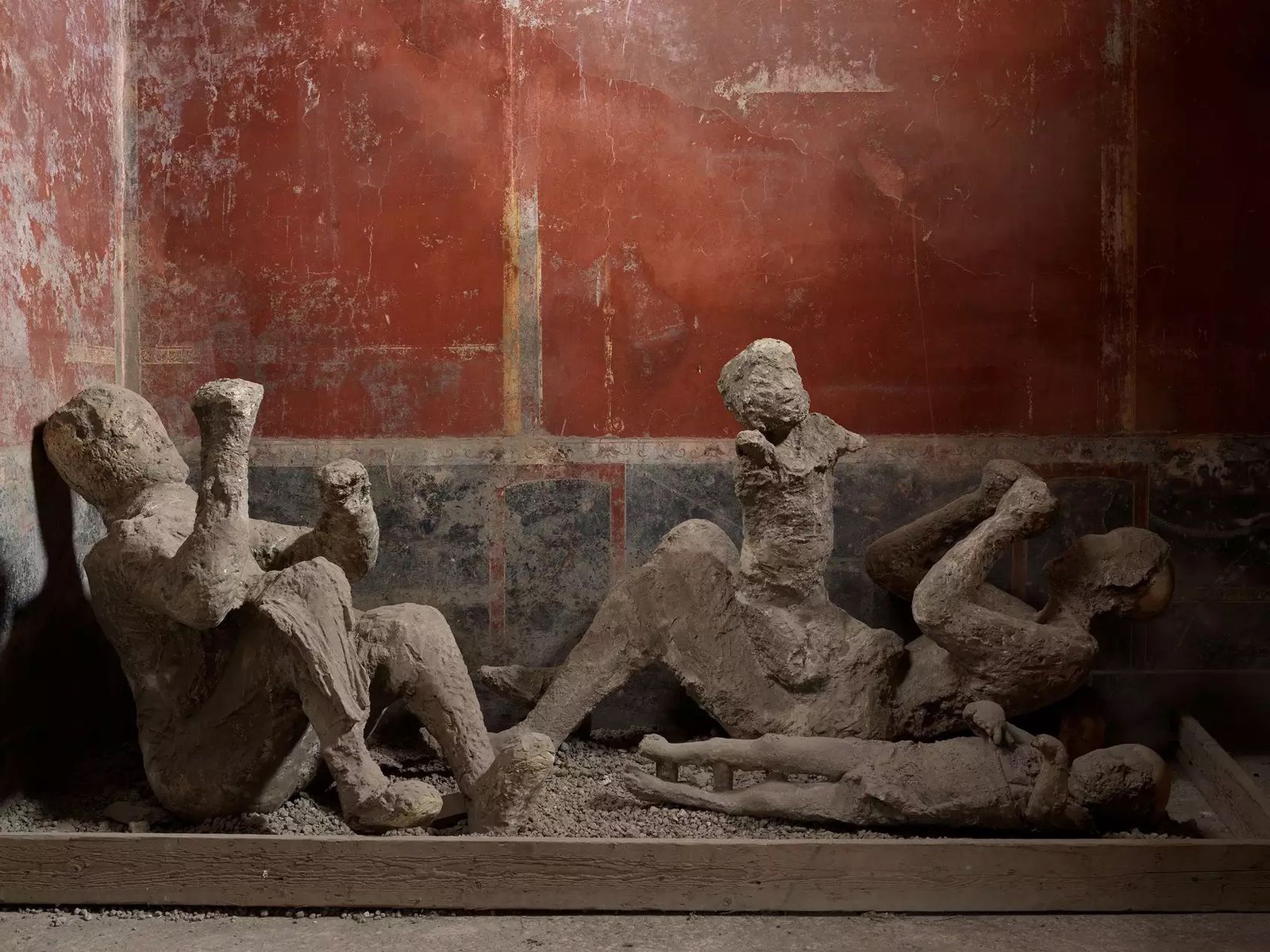 Nineteenth-century archaeologists created the casts by pouring plaster into people-shaped voids in the hardened ash that covered Pompeii, and the casts have come to represent tragic stories. In one dwelling, four figures huddled beneath a staircase have long been perceived as a family. One of the figures, thought to be the mother, holds a small child.