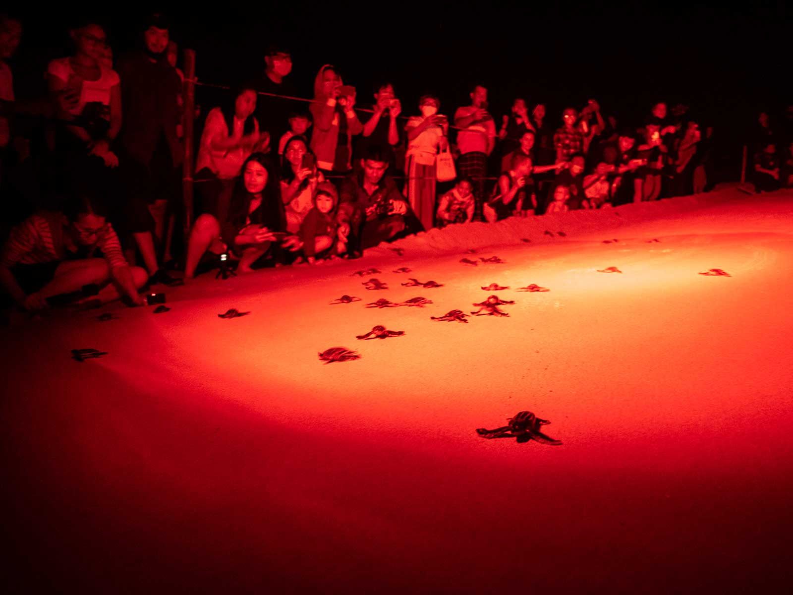 Artificial lights hinder sea turtle nesting success in multiple ways. They discourage female turtles from returning to historical nesting beaches—making them choose less successful locations simply because they are dark. Worse, young turtles hatch at night, when predators are scarce. Light from the moon and stars in the night sky reflects on the ocean and guides the hatchlings to the water. But hatchlings are also attracted by bright artificial lights and may follow them inland, where they become exhausted and dehydrated, or fall prey to birds or other predators. Research also shows that even those hatchlings that reach the ocean can be attracted by artificial lights on the water, which can prevent them from successfully dispersing.