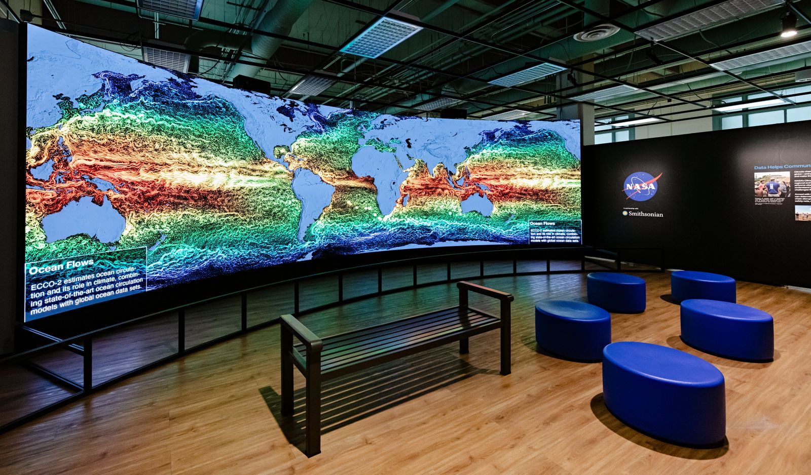The focal point of the exhibition is a 32-foot-long, 12-foot-high screen called a “Hyperwall” that shows views of Earth from space and on the ground, featuring informative visuals made from satellite data. The display offers an overview of the most pressing global environmental issues, illustrating how Earth is affected by human activity with real-time looks at the planet’s climate, weather, land and water.