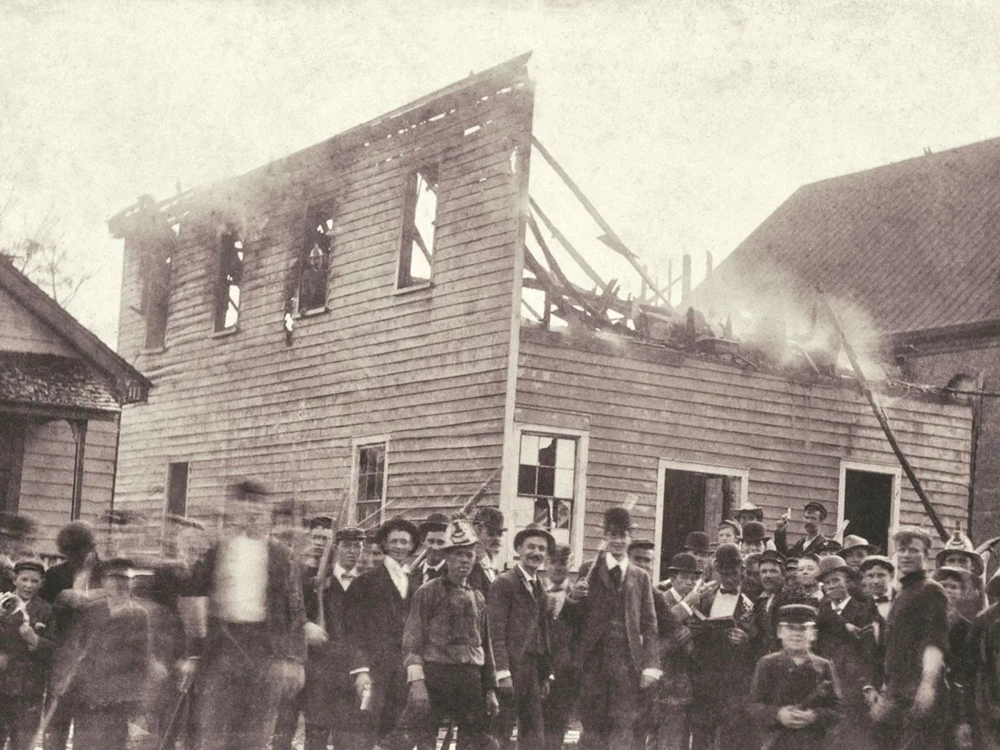 Manly, however, had fled the city after realizing his life was in danger. The crowd turned its attention to the Record building, setting it aflame and preventing the Black fire brigade from getting through until the office was in shambles. The rioters posed for photographs in front of the burned-out structure, smiling proudly before they went off to commit more atrocities.