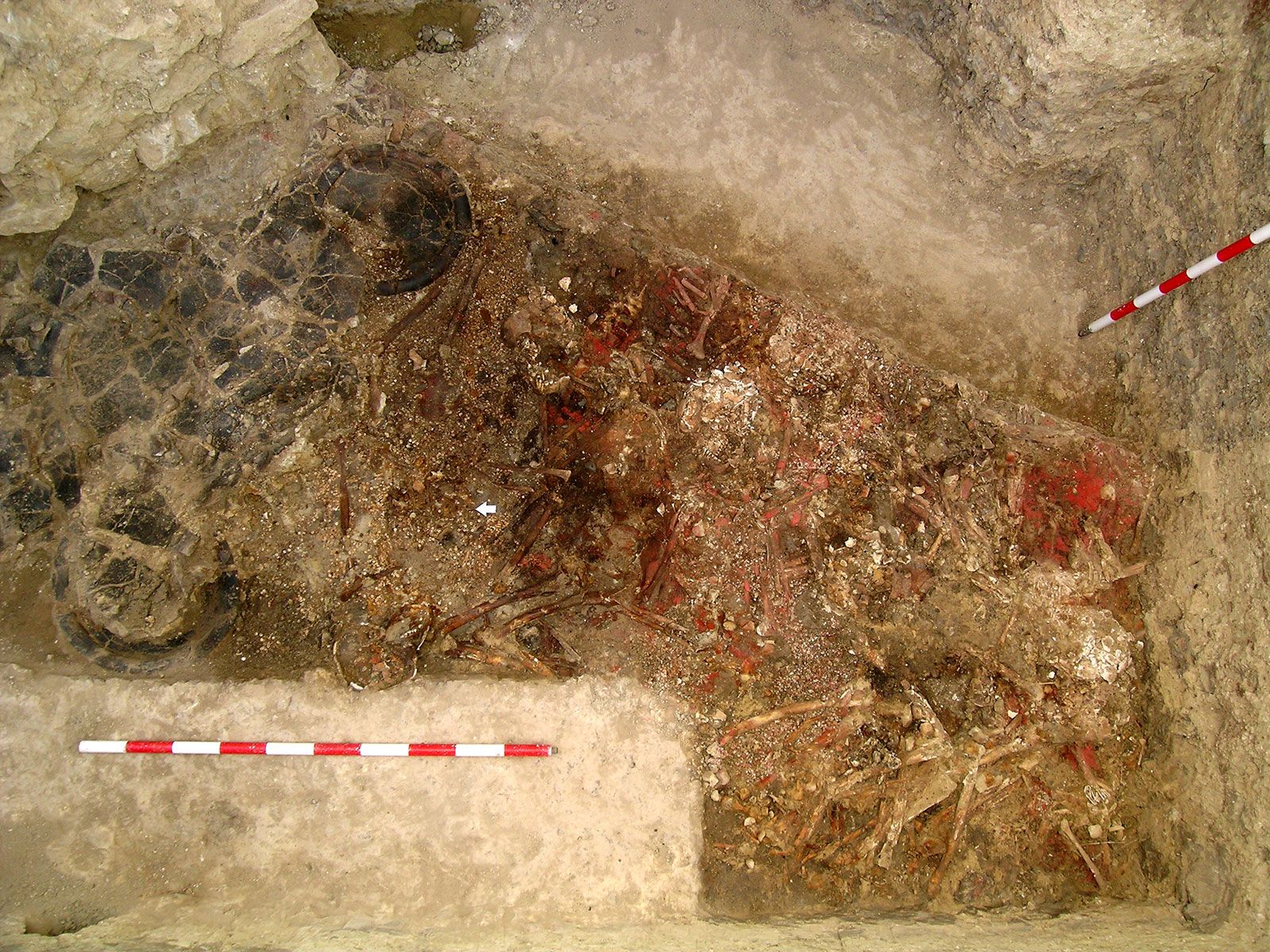 Both “are extremely exceptional graves in the context of the European Copper Age,” says Díaz-Guardamino. In addition to the rich goods, she says, “cinnabar powder is everywhere in those graves.” The super red, shiny powder blankets the bodies, artifacts and some interior surfaces.