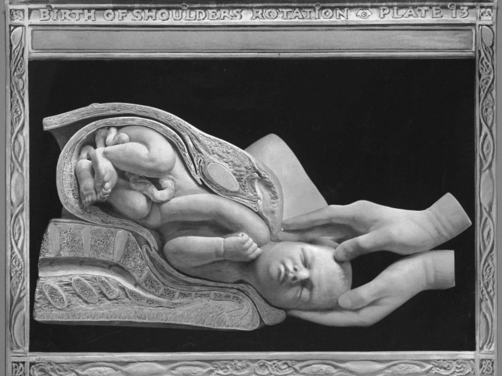 In designing the Birth Series, as the sculptures were collectively known, “Dickinson was riffing off 18th-century sculptures, 19th-century flap anatomies and more,” Holz says in an interview. The artist was inspired by birth models that had been used at the School of Obstetrics in Bologna, Italy, for the past two centuries; drawings by famed Scottish midwife William Smellie; and extensive Mason-jar collections of miscarried or stillborn specimens kept in American museums and laboratories. He also had a newer technology at his disposal: X-rays. Their risks to pregnancy were not yet known, but Dickinson consulted images taken by his colleagues as well as others taken of laboring women that he commissioned specially for the Birth Series. Drawing from these sources, the resulting models were detailed, rendered lovingly, with the growth of the fetus and birth progressing as a serene, beatific event. The woman’s body acted as a frame; her own movements and expressions remained a mystery.