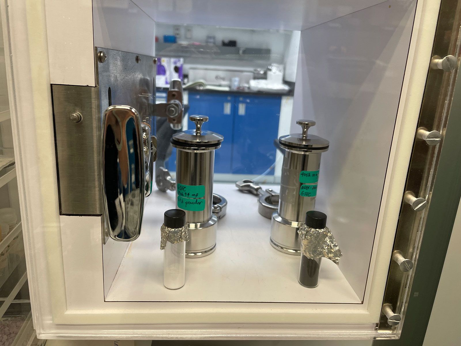 But Bennu underwent none of those geologic or biologic processes; the word used most often by the scientists on the OSIRIS-REx mission team to describe the samples is “pristine.” To keep this one pristine, the lab follows careful protocols: People entering the white room where the sample resides don masks, hairnets, lab coats, shoe covers and nitrile gloves. A sticky mat at the white room door traps any loose particle from the shoe covers. The case holding the glass vial of sample is actually an airlock, with two hatches. Any tools or smaller objects that enter the white room where the sample is kept pass through one hatch, which is closed before the corresponding hatch on the other side is opened.
