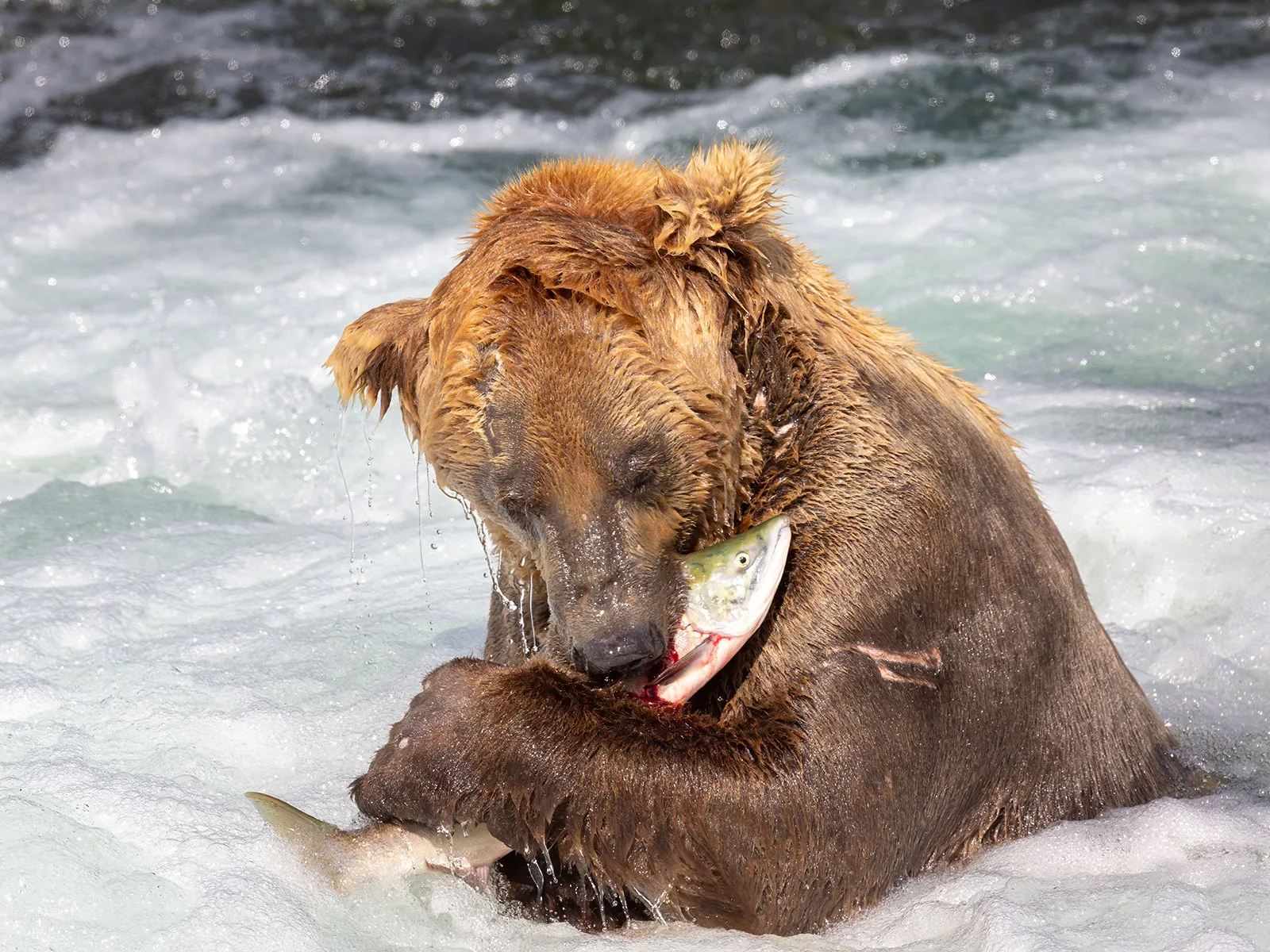 The tournament celebrates fat as a sign of success for the bears, which must consume a year’s worth of food in six months in order to survive the loss of about a third of their bodyweight during hibernation. The week is a testament to the richness of the park’s ecosystem, which allows the bears to thrive. Katmai is home to a massive sockeye salmon run, and Brooks Falls provides a natural barrier to the fish migrating up Brooks River. The resulting salmon scramble amounts to a veritable bear buffet.