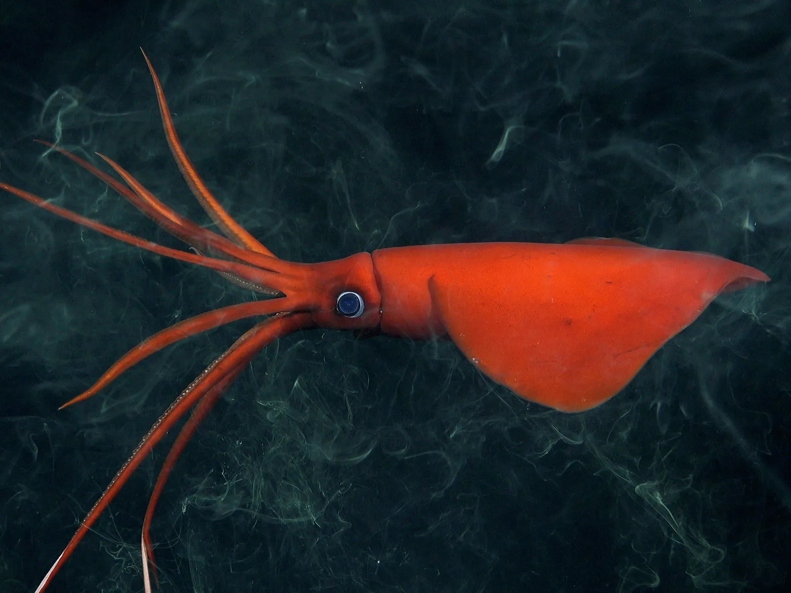 The eerily beautiful glowing sucker octopus is often found in deep Atlantic waters off the U.S. coast. Stauroteuthis syrtensis uses its fins and the webbing between its eight arms to swim. Rows of glowing bioluminescent suckers trail down those arms and shine in the deep sea. Scientists think these glow-in-the-dark suckers may be used to attract planktonic prey like copepods, miniature crustaceans that are drawn to the light. The octopus is thought to prefer ocean temperatures of roughly 37 degrees Fahrenheit and can be found at depths of more than 13,000 feet. The species has been recognized for more than a century, but only in 1999 did scientists discover that it glowed.